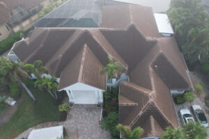 Check out one of our roof cleans from last week. We soft washed a big concrete tile roof and brought the color back to the roof tiles. This roof was discolored from organic growth. Our soft washing services are top notch. Low pressure cleaning to ensure no damage to the property takes places. Algicide is applied to the roof tiles treating the organic growth discoloring the roof. Also, this preserves the roof from getting dirty as quickly as it would from pressure washing the roof. After the clean the algicide is neutralized. We water all vegetation before the clean, during the clean and for about thirty minutes after the clean. This ensures no damage will happen to vegetation. We also bag off downspouts to prevent run off. Every roof clean job is a two man job! Click read more to see the before and after photos.